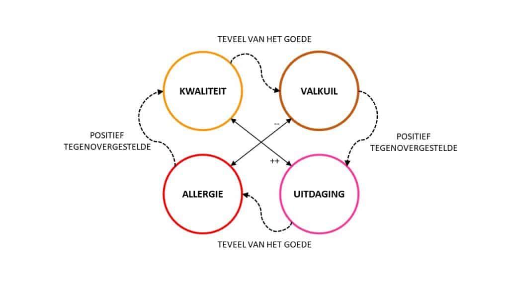 Bijv als jouw kwaliteit ‘daadkrachtig’ is, en je laat er teveel van het goede van zien, dan is de valkuil ‘drammerig’. Als je vervolgens wil weten wat dan je uitdaging is, bepaal dan het positief tegenovergestelde van de valkuil. Dat is dan ‘geduldig’. Tot slot kun je bepalen wat jouw allergie is. Dat is teveel van het goede vanuit de uitdaging. Dus als je teveel geduld laat zien dan kan dat als ‘passief’ beschouwd worden. Als daadkrachtig persoon zul je snel herkennen dat je niet tegen ‘passieve’ types kunt. Het mooie van dit model is dat je vanuit ieder kwadrant kunt starten. Dus als je merkt dat je je vaak stoort aan iemand dan kan de eigenschap van die persoon je juist helpen om voor jezelf jouw kwaliteit te benoemen. Want je hoeft dan alleen maar te bepalen wat het positief tegenovergestelde is van die eigenschap. En vanuit een gekregen compliment kun je dus ook jouw uitdaging gaan bepalen.